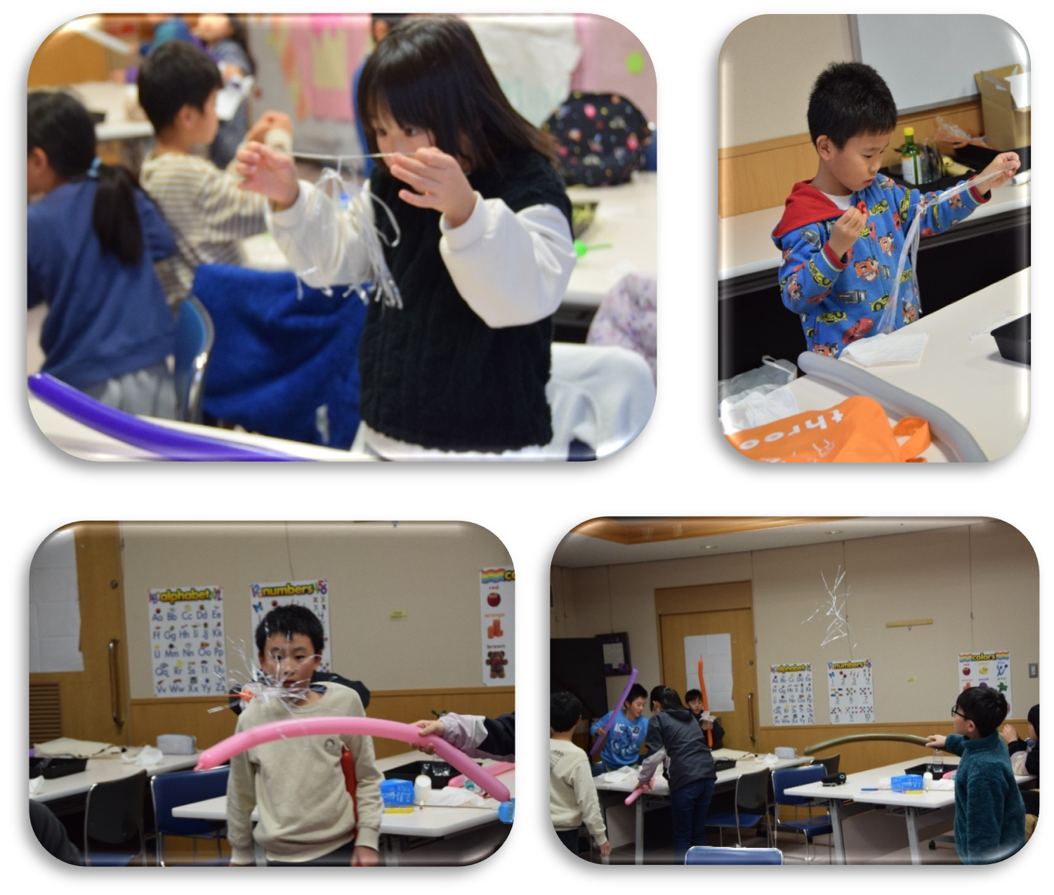 風船をつかった静電気の実験を行いました。ふうせんが壁にくっついたり、髪の毛を引き付けたりする楽しい実験を行いました。