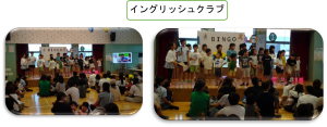 最初に、アリーナのステージで各クラブの発表を行いました。クラブの活動でやってきたことやクイズ・歌などを発表しました。