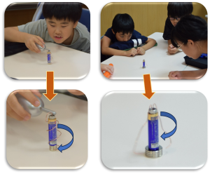 ペットボトルで「シャボン玉」「浮沈子」や「トルネード」を作って遊びました。