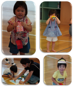 双眼鏡をつくってのぞいたり、サンバイザーをつくって頭にかぶってみたりしました。