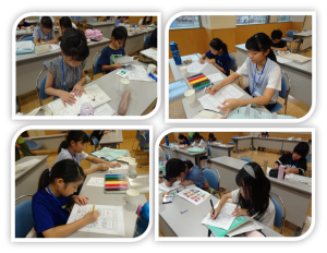 まずは、小グループになり、どのPOPをどのように描くのかを話し合いました。学校も学年も違うことで、戸惑いもありましたが、少しずつ会話が出始め、徐々に形になっていきました。次回(8月)は、今回の続きと、残り4枚の下描き&完成をします。あきまつりの各種コーナーPOPづくりの取り組みも行います。少し慌ただしいですが、みんなで協力して頑張って取り組みます。また、色々なものが形となって行く過程も楽しんでいけるようにしたいと思います。