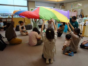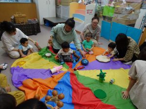 ▲パラバルーンで遊んだり、楽器や音が出るおもちゃに触れました。
